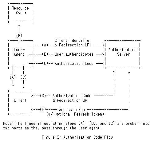 - User-Agent: Authorizaiton Code Grant Flow는 http redirection 베이스로 Authorization을 진행하기 때문에 Resoure-Owner의 User-Agent와 상호작용합니다. 예를 들어, 웹 브라우저가 있습니다.